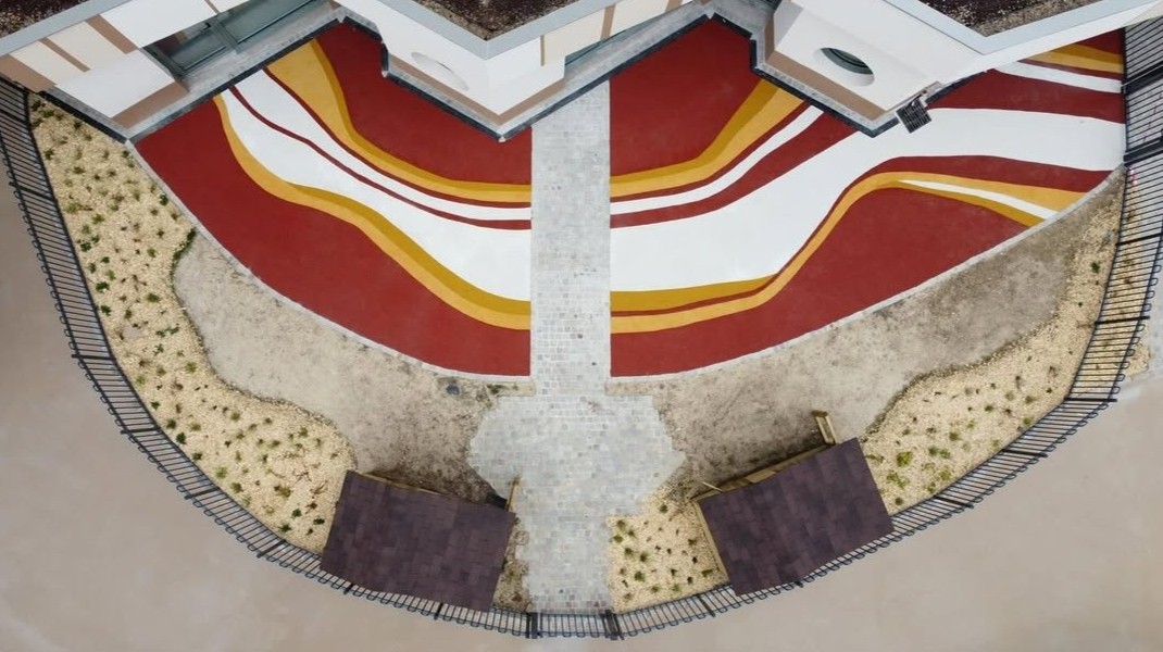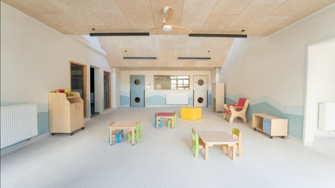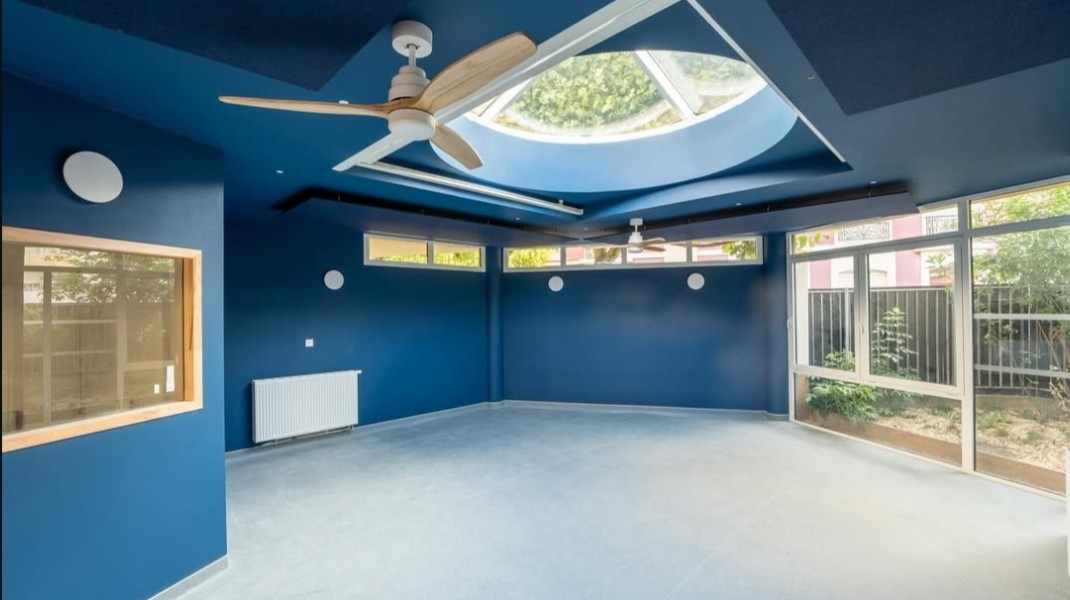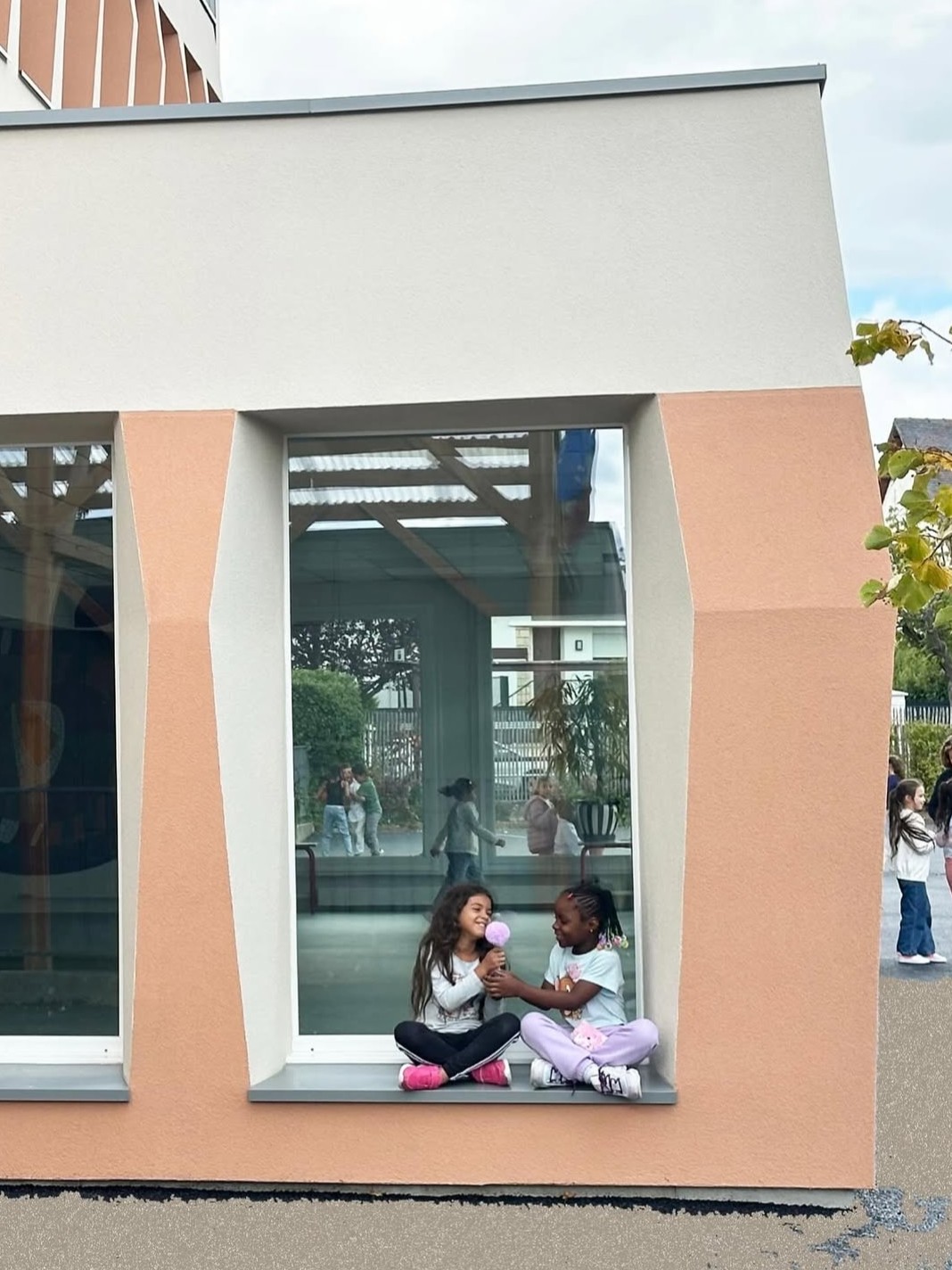 Un bâtiment coloré qui se s’articule autour d’un nouvel espace de jeu pour les enfants.