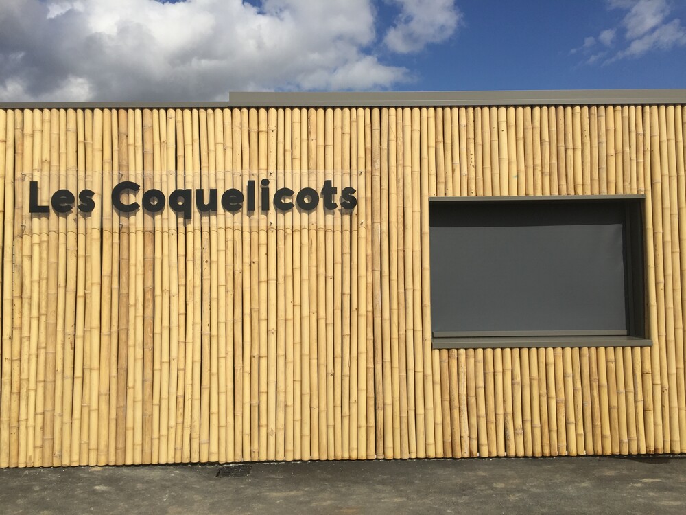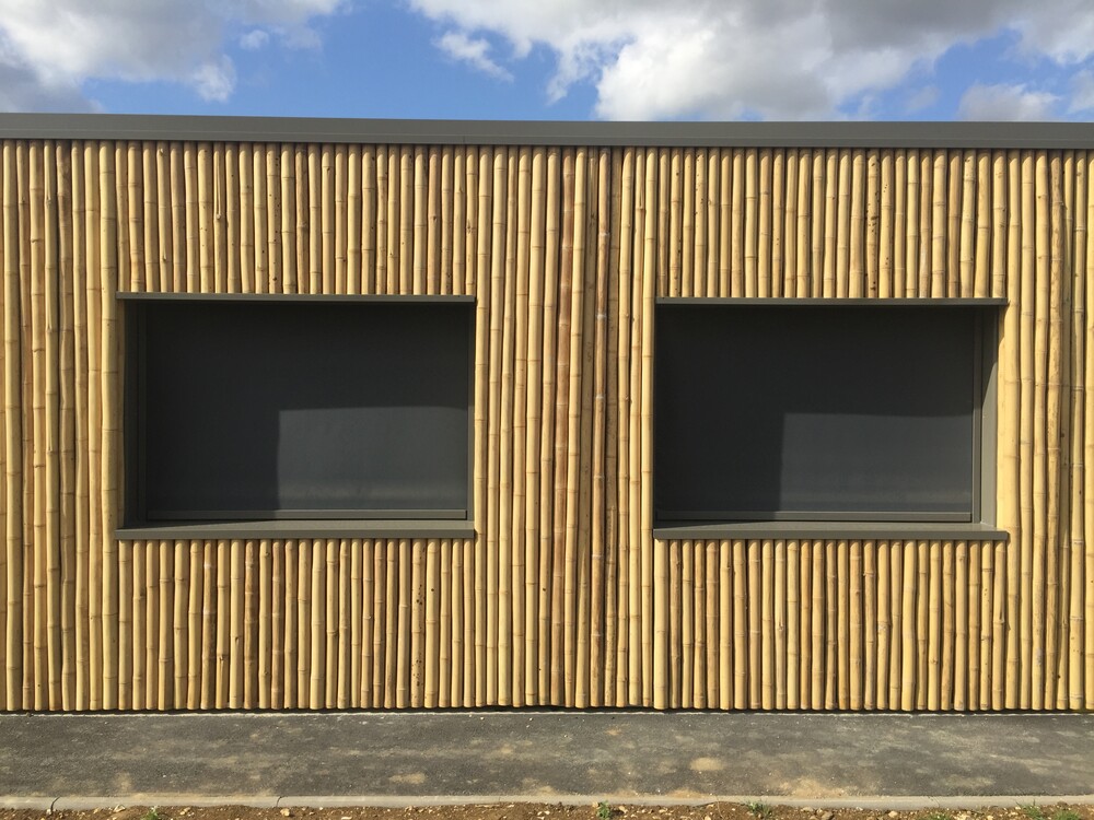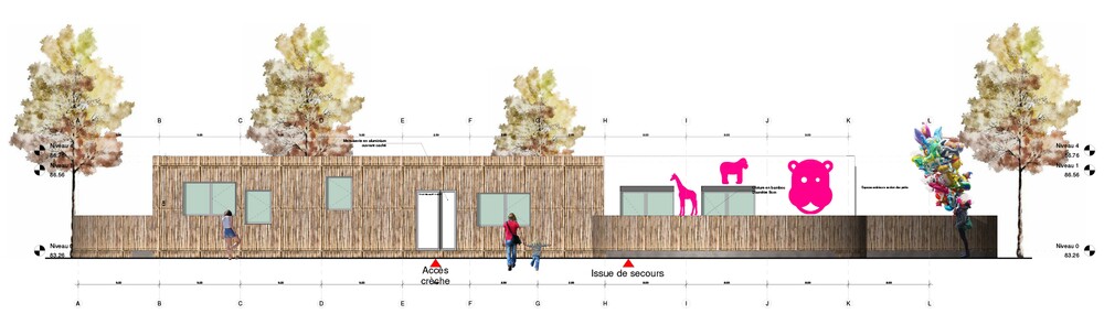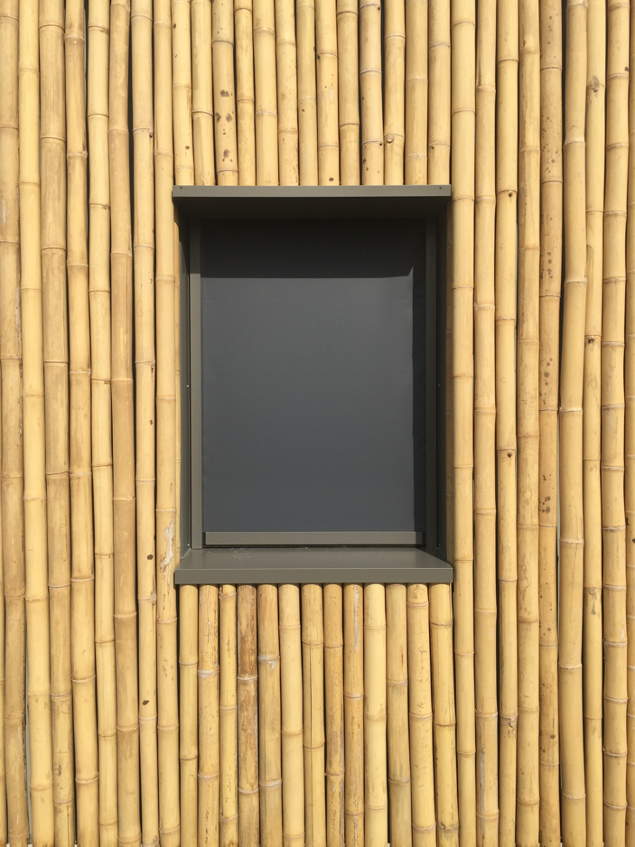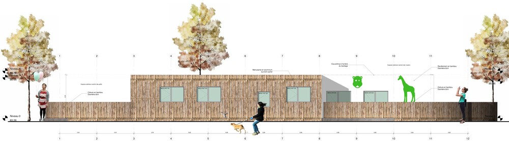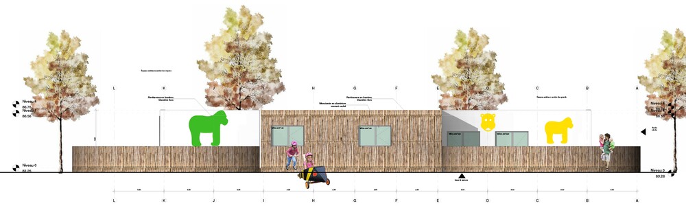 Les façades sont entièrement recouverte de bambous évoquant l’image chaleureuse, poétique et réconfortante de la cabane. La disposition aléatoire des fenêtres accentue le caractère ludique du bâtiment: certaines fenêtres à hauteur des adultes s’ouvrent sur l’extérieur, d’autres à hauteur des enfants restent fermées et offre aux tout-petits une vue sur le jardin.